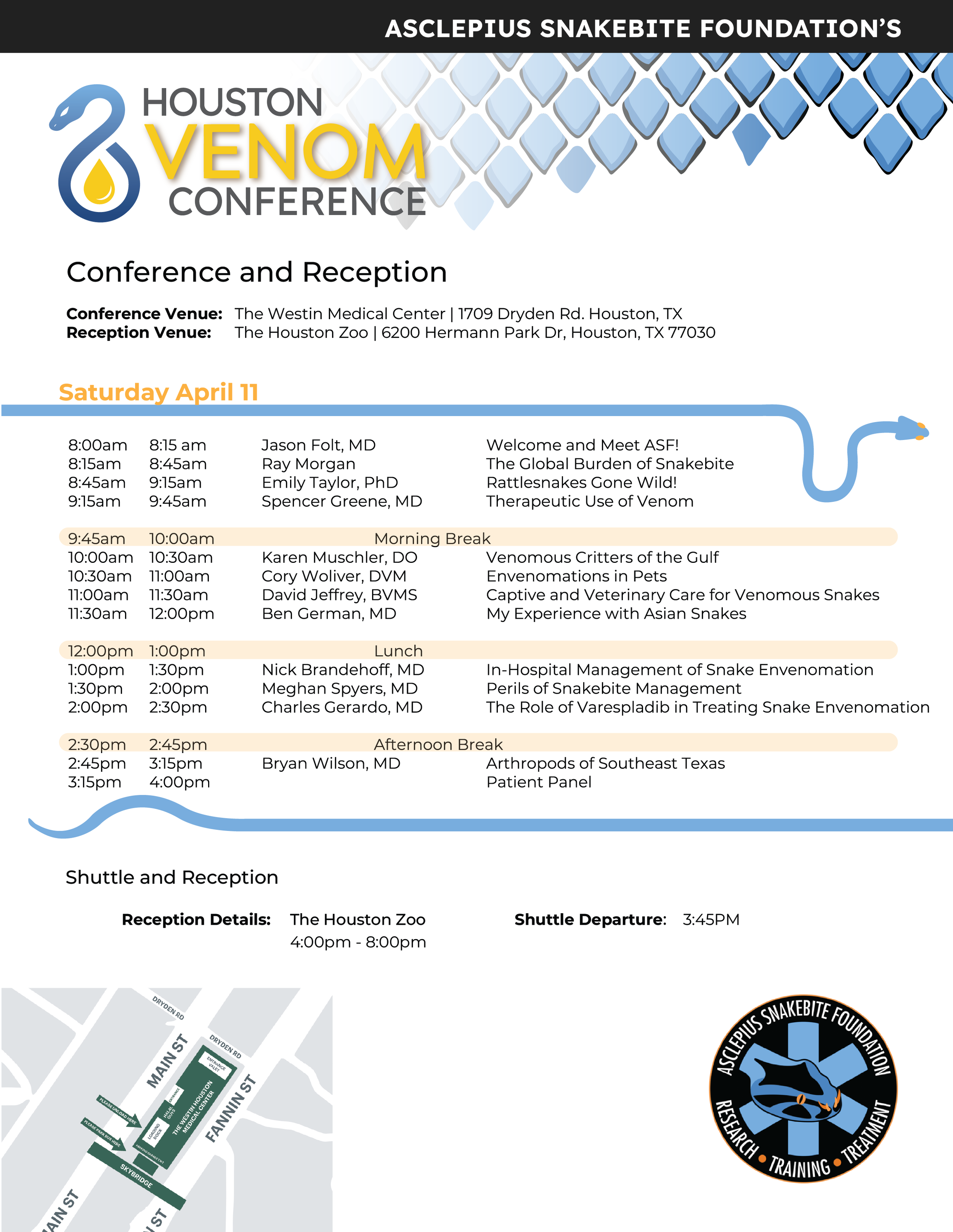 Mark your calendars for the Houston Venom Conference on April 11th hosted by the Asclepius Snakebite Foundation. This year, we will host it at the Westin Houston Medical Center/Museum District, followed by an exclusive evening at the Houston Zoo's Reptile and Amphibian House. Human and veterinarian CE will be available.